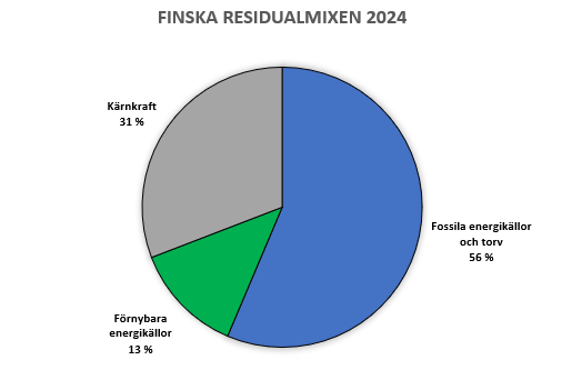 Finska residualmixen är sammanställningen av årets import och export som sammanställs nästkommande år över hur energimixen har sett ut under innevarande år. Miljöpåverkan för den finska residual mixen år 2024 var 390,93 CO2 (g/kWh) med kärnbränsle på 0,86 mg/kWh